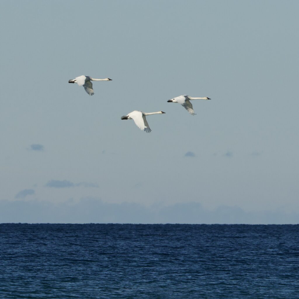 The 28th of October brought the first group of Trumpeter Swans for the fall season! This group of 5 landed nearby to rest along the shoreline and then continued on to the south. Recent telemetry studies of Trumpeter Swans at Seney NWR have shown this population migrates eastward in the fall and many are known to pass through the Straits area.