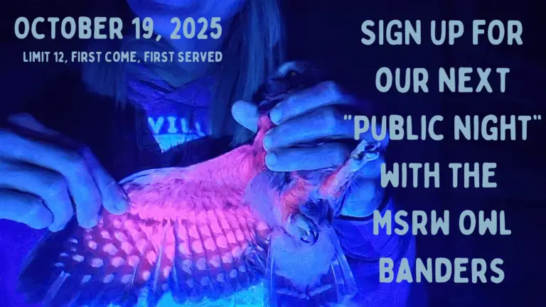 Sign up: email our Executive Director, Scott Davis, with your name and phone number (in case of the need for a last minute cancellation) to reserve a spot for the night and get the logistical details. Limit 12 visitors – first come, first served. Also, please NOTE that you must be a MSRW member to participate, so if you’re not already a member, please donate membership dues by the night of the banding event.
