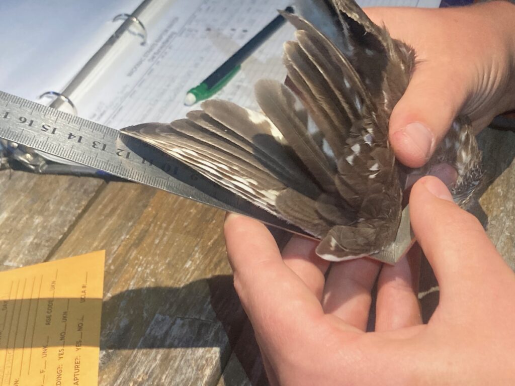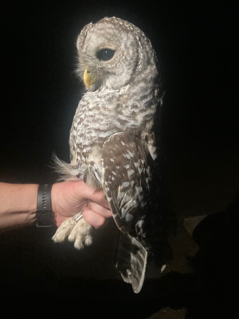 We captured our first birds other than NSWOs this week! Our first barred owl (BDOW) was captured on the 3rd after consistently hearing one near our banding station. Known for their hooting “who cooks for you?” call, these larger, more powerful owls actually prey upon NSWOs and are often captured because they are attracted to the audio caller we use to lure in the latter. It’s thus important for us to regularly check our nets throughout each night to make sure the smaller owls are not harmed.