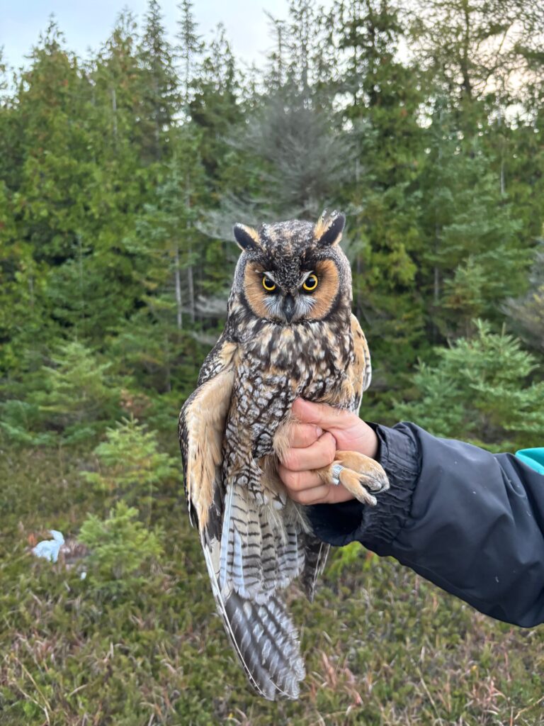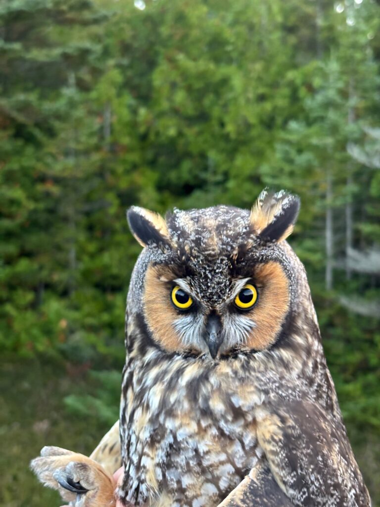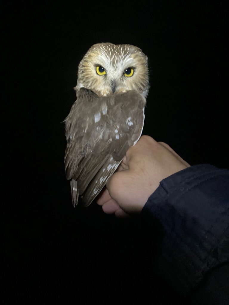 A common point of discussion with the many visiting groups to our banding station the past couple weeks has been the adaptations that make owls such successful nocturnal predators. There are several that we would like to summarize here. The rounded, disc-shaped face of owls that gives them their iconic look has a purpose. Known as a facial disc, this feature allows owls to funnel sound and works in tandem with their asymmetrical ears. One ear is higher than the other, unlike the symmetry exhibited in humans and most other animals. In addition to great hearing, owls also have excellent vision by using their large, forward-facing eyes that are adapted to low-light conditions. However, their eyes are fixed in place and thus to compensate for this, owls have greater flexibility in their neck which is accomplished by having additional cervical or neck vertebrae.