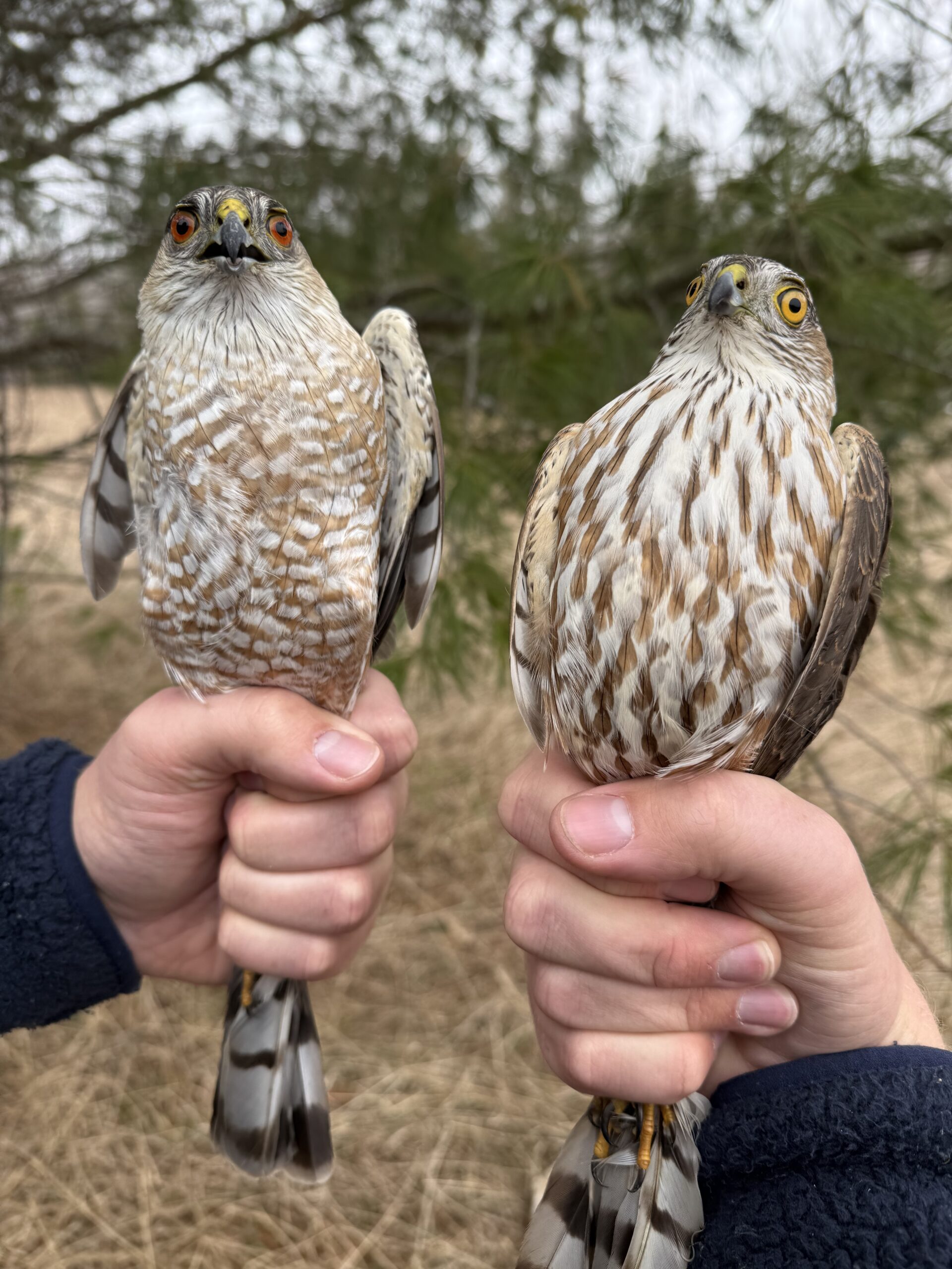 Today we had an adult and a juvenile sharp-shinned hawk, both females, in the blind at one time. We thought we would use the opportunity to highlight some of the differences between them. Notice how the adult has horizontal bars in a more rufous tone on the chest and dark red eyes (left bird), and the juvenile has vertical brown streaks on the chest and yellow eyes (right bird).