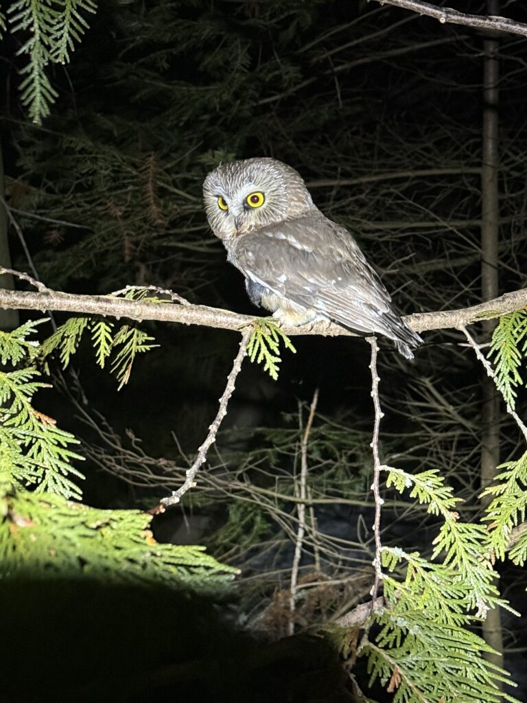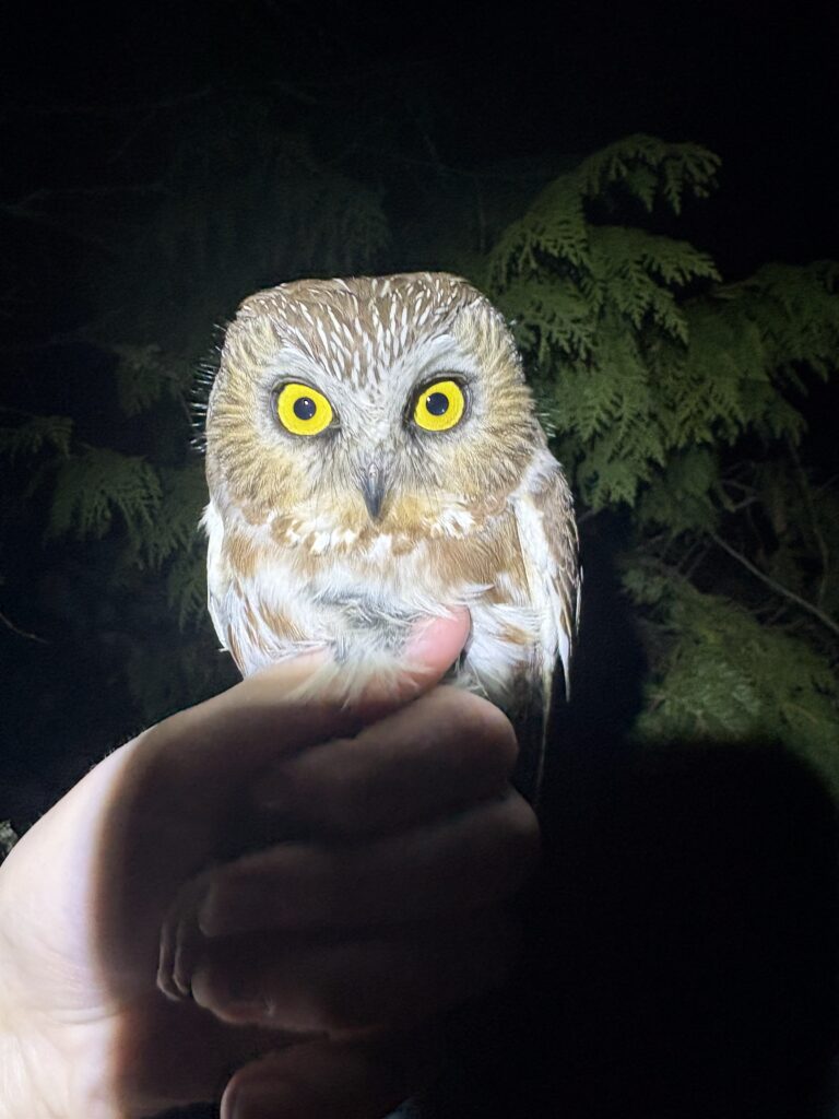We are always on high alert for changing weather conditions ranging from high winds that may move in mid evening, to a pop-up thunderstorm during the wee hours of the morning. We faced these conditions and more in the past week, causing us to close early two of the past seven nights, and not open at all on the night of the 27th due to snow, wind, and a temperature that dropped below our threshold for banding. We also had a night with not a single owl caught all night. In spite of the weather, we do get the opportunity to appreciate moments relative to this work and the hours we operate.