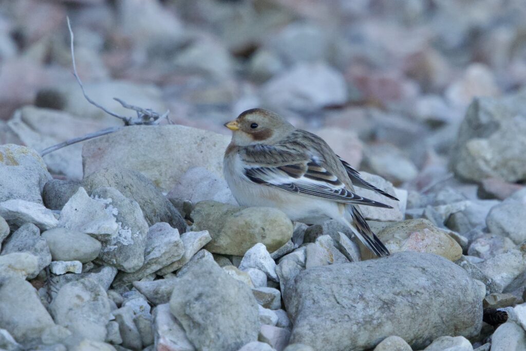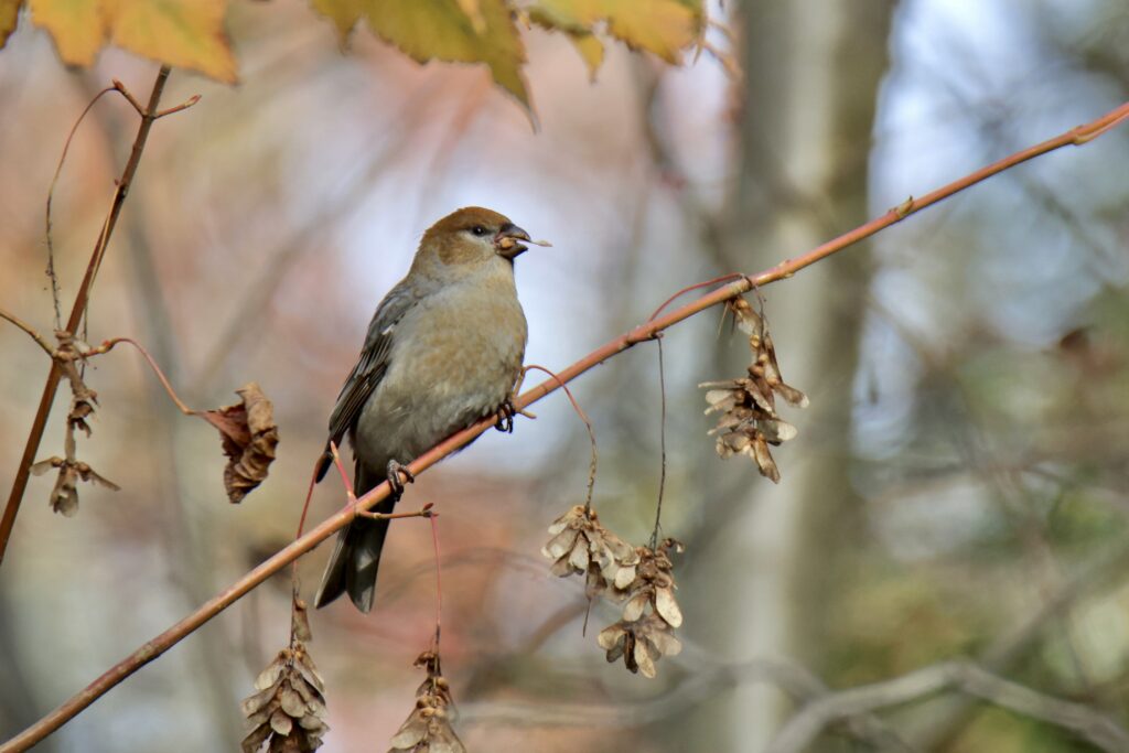 Waterbirds have been distant this week! Late season passerines have been more cooperative for photos. Groups of Snow Buntings are a common sight along shorelines during late fall. A female Pine Grosbeak was found enjoying the seeds of a nearby maple tree.