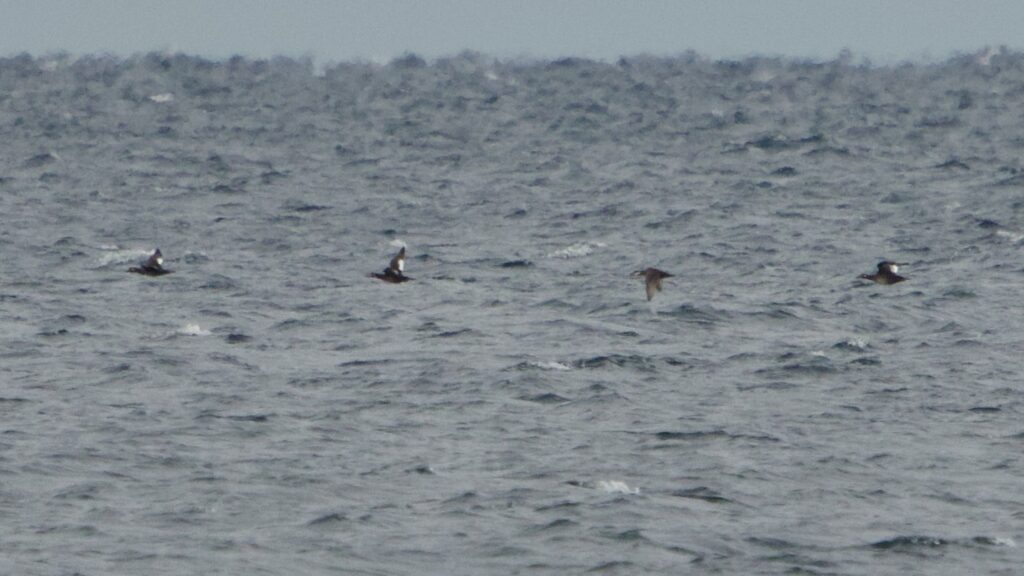 Weeks of impressive loon flights have so far tallied 3,380 Common Loons (286) and 145 Red-throated Loons (12). An exciting moment occurred on November 2nd as the first Pacific Loon (1) for the count landed at McGulpin Point! It offered distant, but satisfying views as it foraged offshore. The breeding range of Pacific Loons extends east across Hudson Bay, and individuals often end up on the Great Lakes during winter and migration. Sightings in the east are becoming more regular. Compared to Common Loons, Pacific Loons are smaller in size with a slender bill, clean neckline and thin chinstrap.