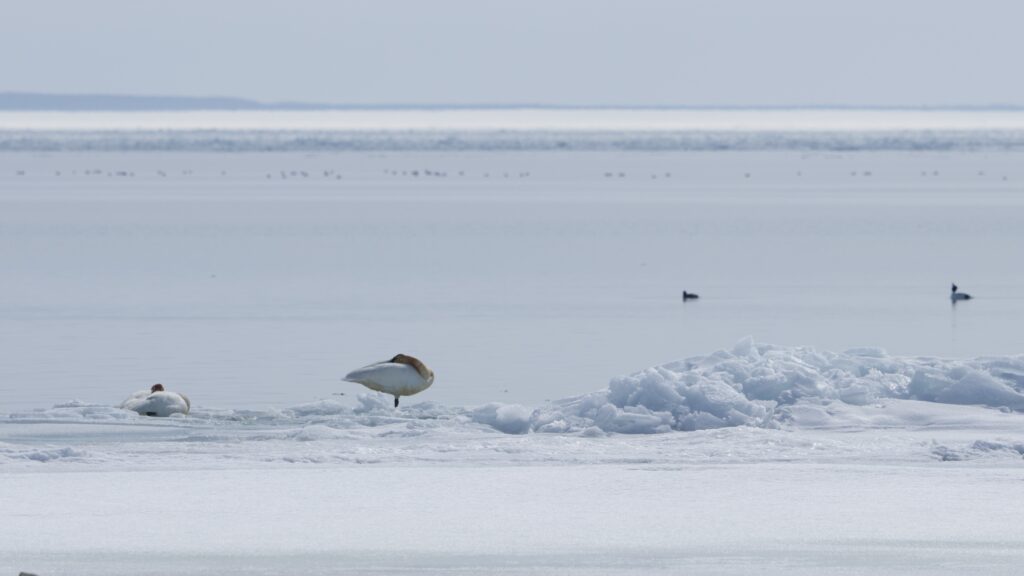 On a calm day at Graham Point on 3/30, a pair of Trumpeter Swans climbed onto the ice at Graham Point for a nice afternoon snooze.
