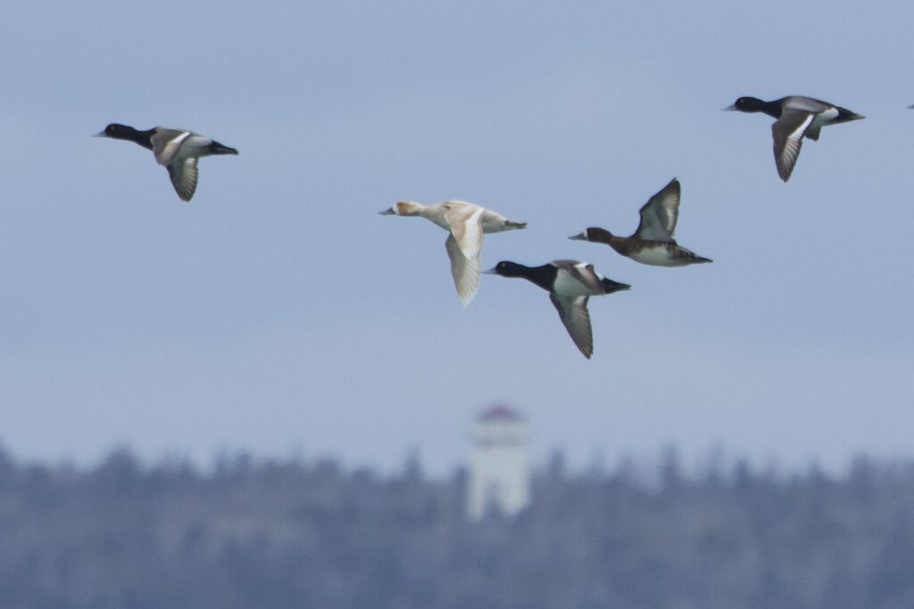The floodgates opened on 04/18 featuring a movement of almost 10,000 ducks at McGulpin Point. The bulk of the count consisted of Long-tailed Ducks (7,027) and Red-breasted Merganser (2,501). Dabbling ducks made a fantastic showing! Daily totals included 154 Northern Pintail (188) and 121 American Wigeon (144). This count represented the first decent flight of Gadwall (56). A Mallard x American Black Duck (hybrid) (1) flew west among a group of Mallard (63), a common hybrid in the eastern US. Greater (937) and Lesser Scaup (632) were also featured prominently. An unforgettable moment occurred late in the day when a leucistic scaup flew by within a Lesser Scaup flock. This genetic mutation is exceptionally rare in waterbirds and can be a once in a lifetime sighting for some birders.